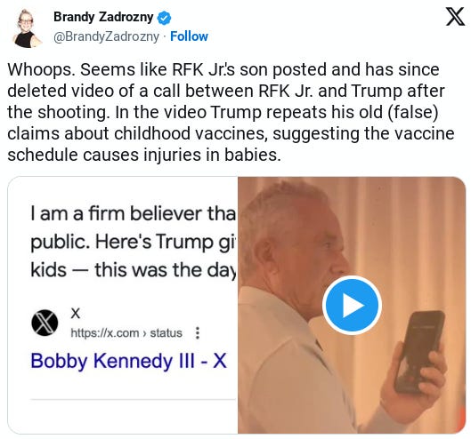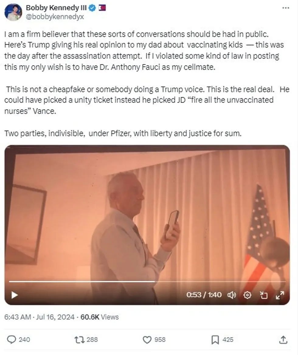 RFK Jr's son posts video purportedly showing Trump anti-vax rant with his dad.