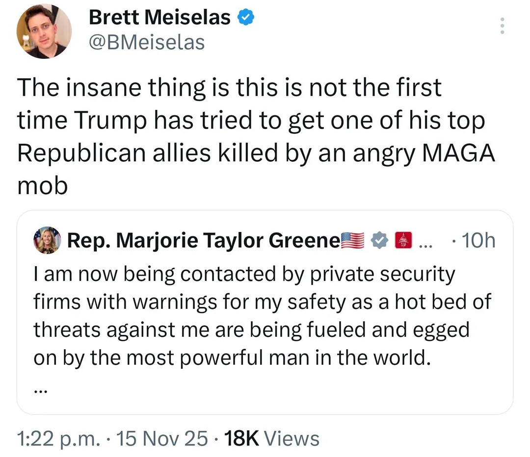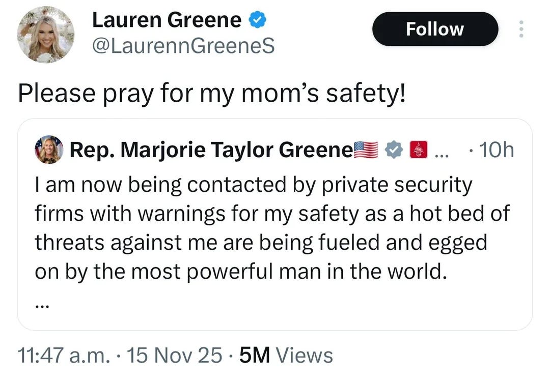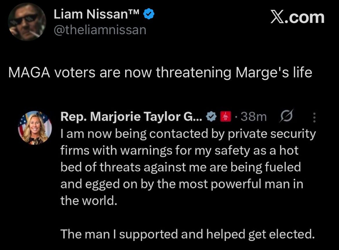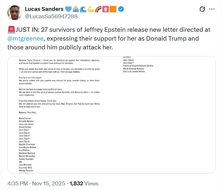 Marjorie Taylor Greene getting death threats from MAGA Nazis after she called for the release of the Epstein files.Liberals and Epstein victims are coming to her defense.Bad ChoicesNov 16, 202522610ShareBad Choices Make Good Stories is a reader-supported publication. To receive new posts and support my work, consider becoming a free or paid subscriber.SubscribePrevious