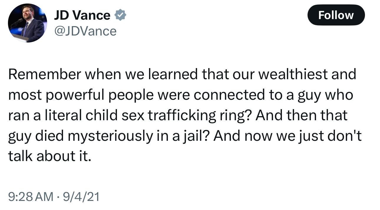 This old JD Vance tweet about Epstein's pedo client list aged like milk. 😂