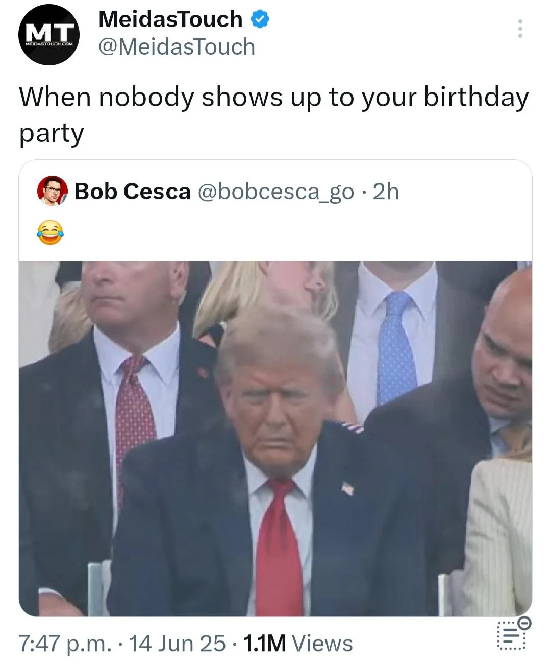 Trump humiliated as tiny crowd braves drizzle for his $45M military birthday flop.